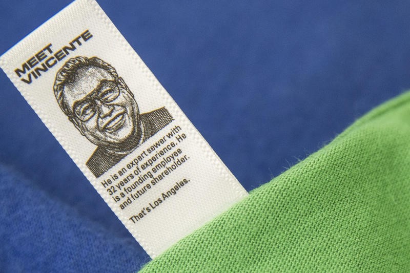 Esempio di Los Angeles Apparel che nelle etichette delle sue maglie ha inserito facce e descrizioni dei manifatturieri.
