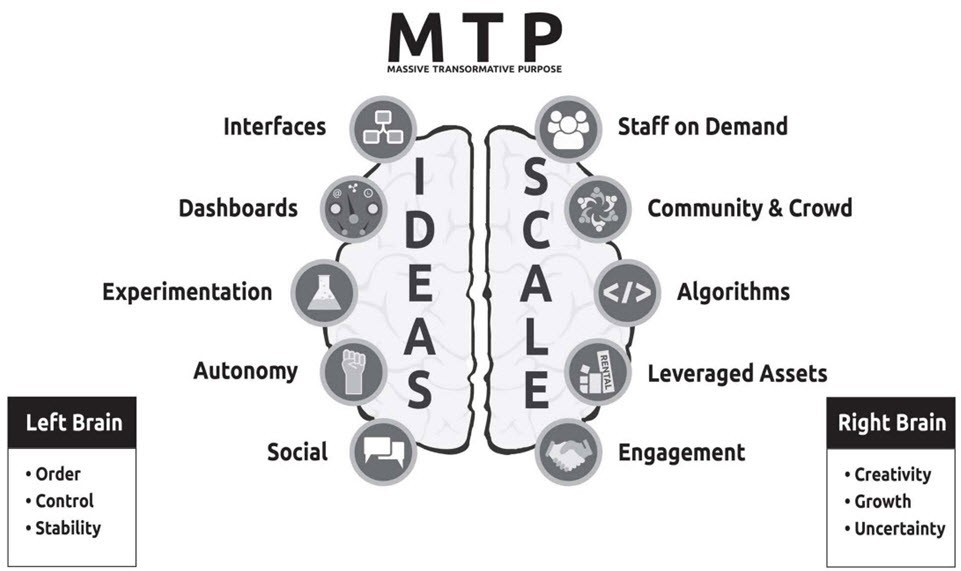 Oltre all’MTP, Ismail identifica dieci “pilastri” delle organizzazioni esponenziali, suddivisi in due gruppi da cinque caratteristiche, che rappresentano, convenzionalmente, l’emisfero destro (creativo) e sinistro (razionale) della mente umana, come riportato in figura.