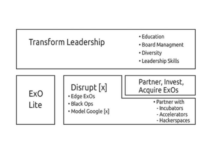 La prima opzione – trasformare la leadership – prevede l’ipotesi di far seguire corsi di formazione (qui utilizzati da Ismail per promuovere la Singularity University, di cui è fondatore); di migliorare il controllo di gestione – attraverso le creazione di un gruppo specializzato nella trasformazione esponenziale che opera come “braccio destro” dell’amministratore delegato; e 3) implementare misure per promuovere la diversity a tutti i livelli dell’organizzazione, soprattutto nelle posizioni di responsabilità e controllo.